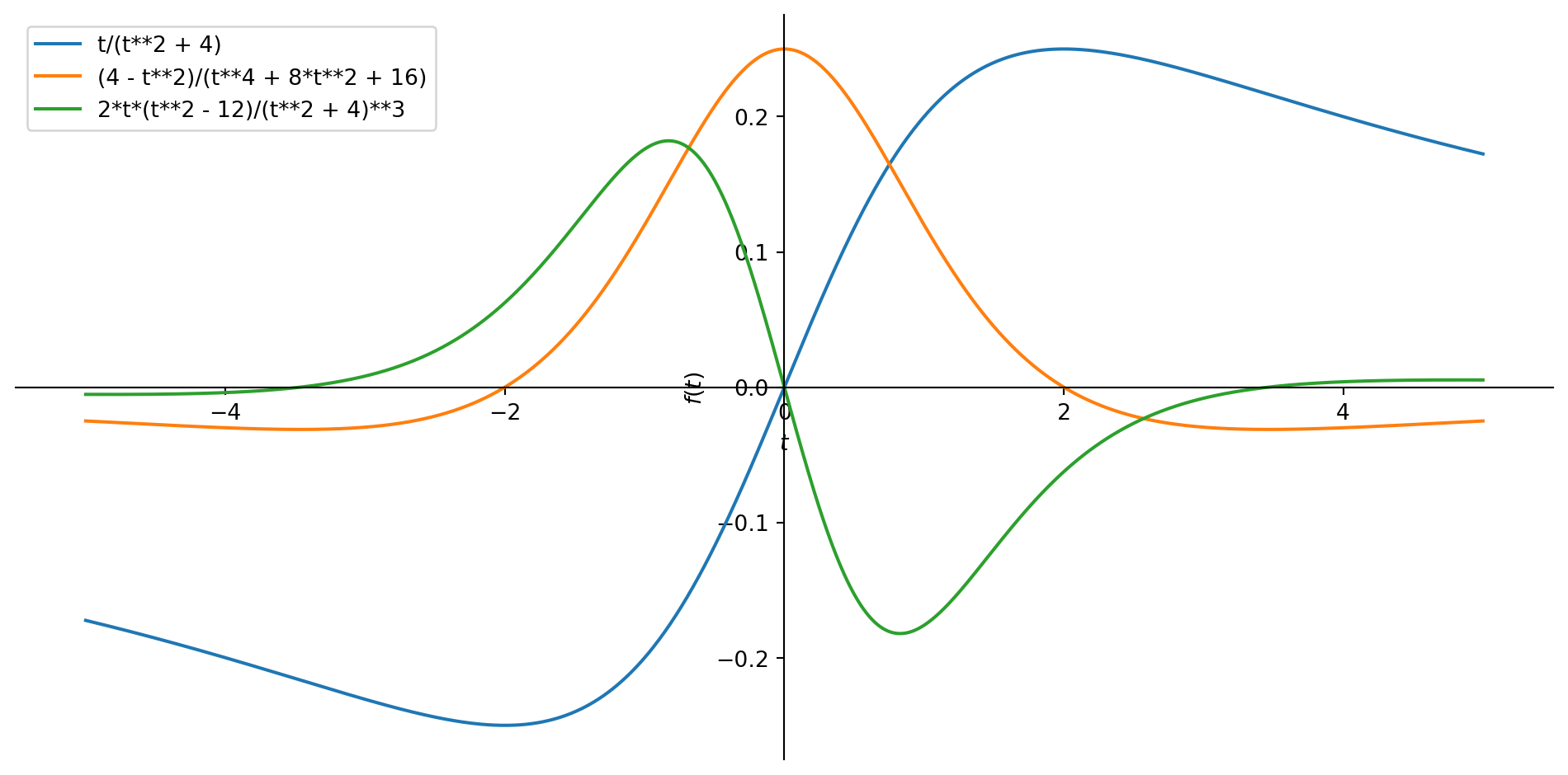 Consider \(c(t)=t/(t^2+4)\). What are the first two derivatives? In a picture: